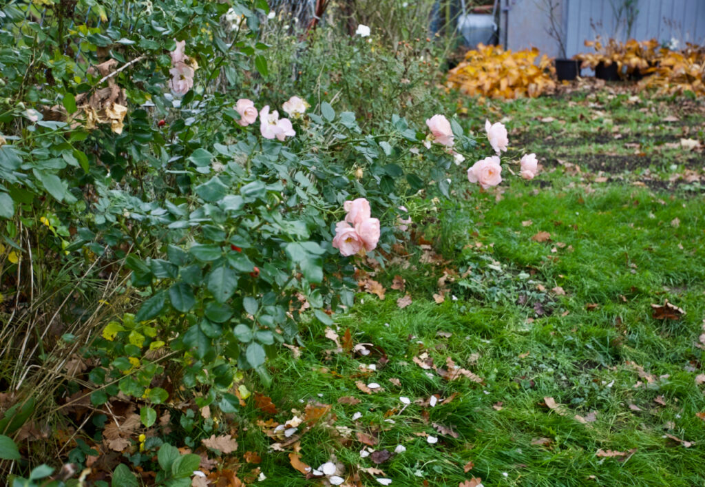Dafür blühen die Rosen immer noch, so schön sieht das aus. Und im Hintergrund leuchtet das Laub von den Hostas die noch vom Vorpächter sind.
