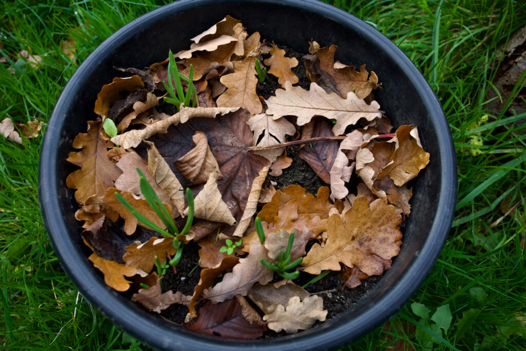 Da sich Eichenlaub recht langsam zersetzt, ist der Anteil davon in den Beuteln etwas kleiner. Man hätte die trockenen Blätter vorher noch mit dem Rasenmäher klein häckseln können, aber vielleicht klappt es auch so.