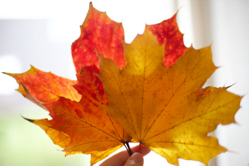 Meine Lieblingsbäume sind dabei auf jeden Fall die Ahornbäume, die immer so wunderbar leuchtende Farben produzieren. Ein paar Blätter habe ich gesammelt und, damit sie noch ein bißchen mehr strahlen, vor dem Fenster fotografiert.