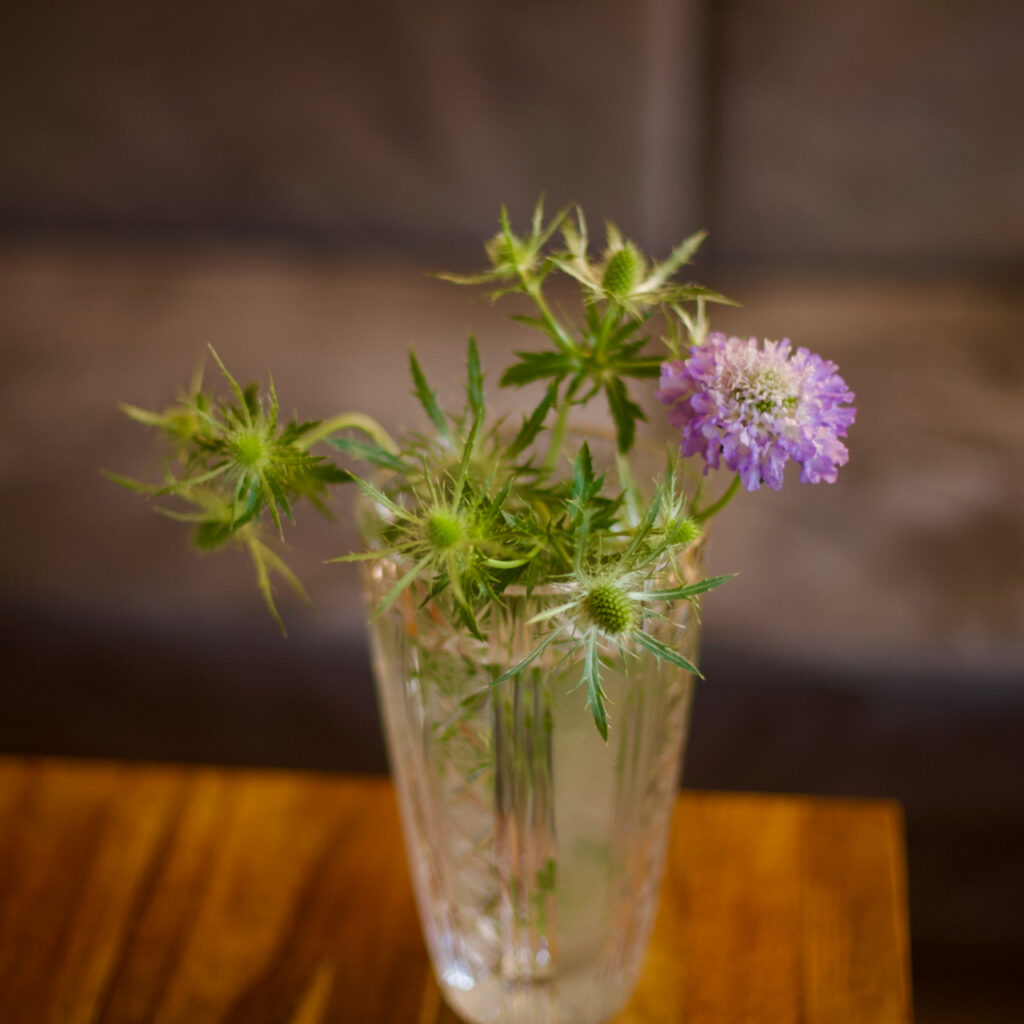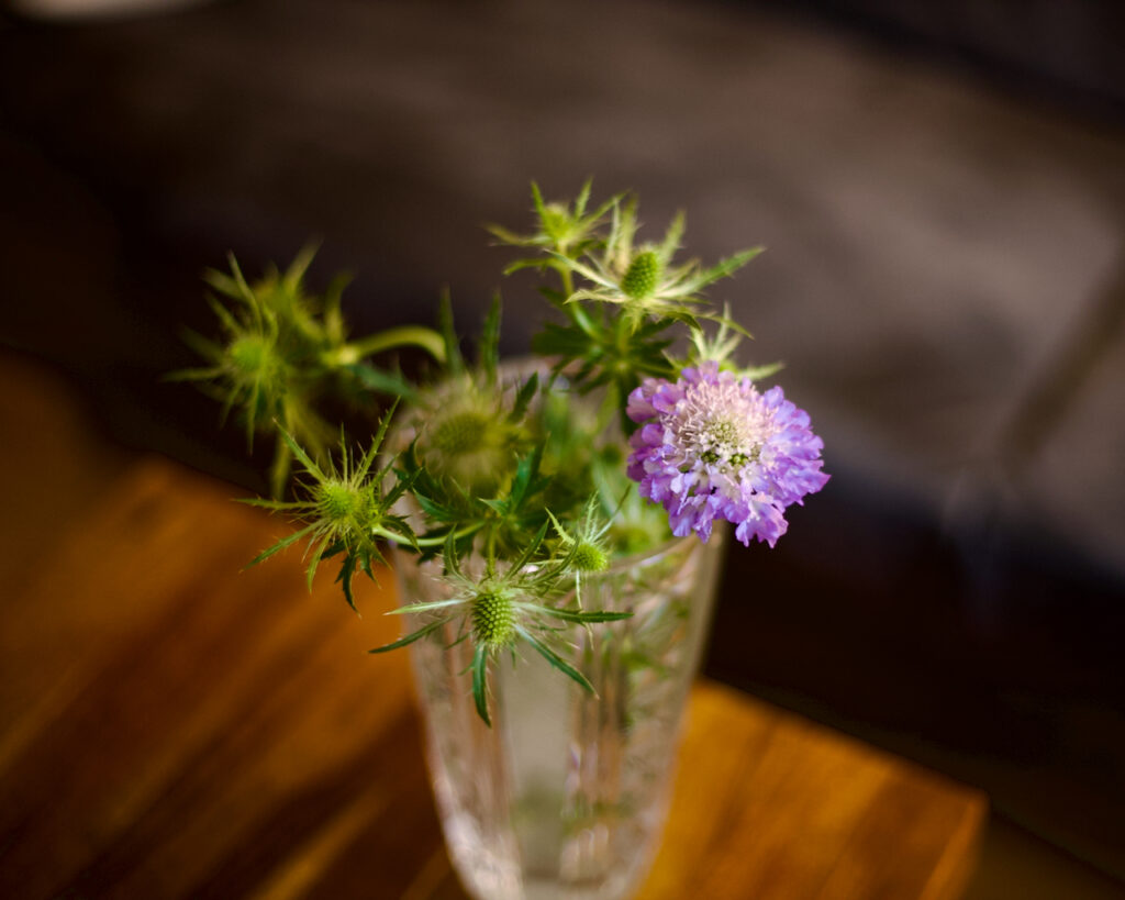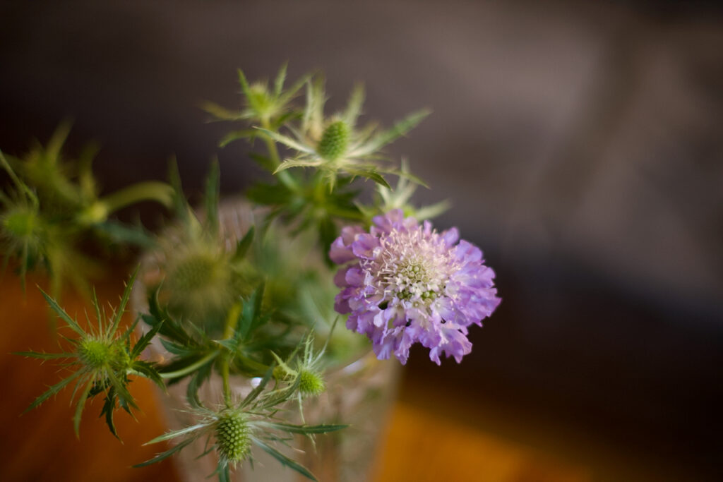 Bis der Frühling aber so richtig da ist, freue ich mich erstmal über die Blüten oder auch nicht Blüten, die momentan noch zu finden sind. Beim letzten Gartenbesuch bemerkte ich, dass der weiße Mannstreu im Sturm gelitten hat und zwei Äste abgebrochen waren. Dazu kommt die sehr spät blühende gefüllte Skabiose. Zwei Blüten hat sie noch gebildet, eine durfte mit nach Hause und blühte in der Vase noch mal weiter auf, so schön.