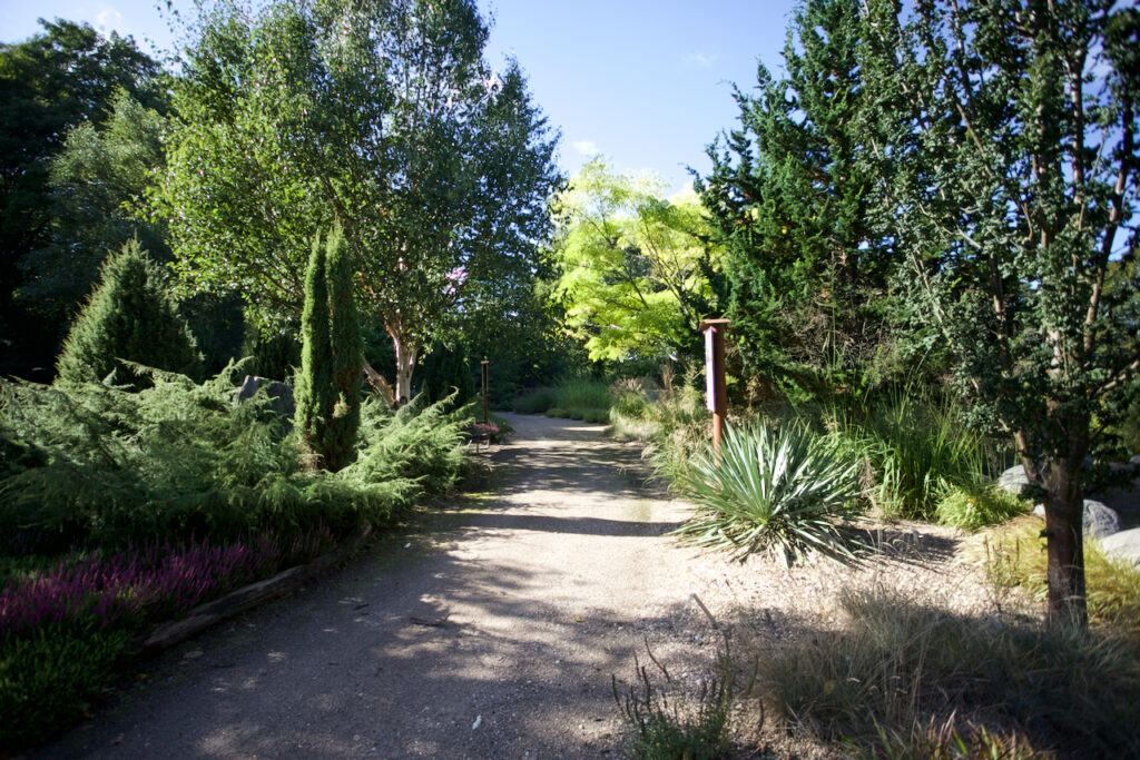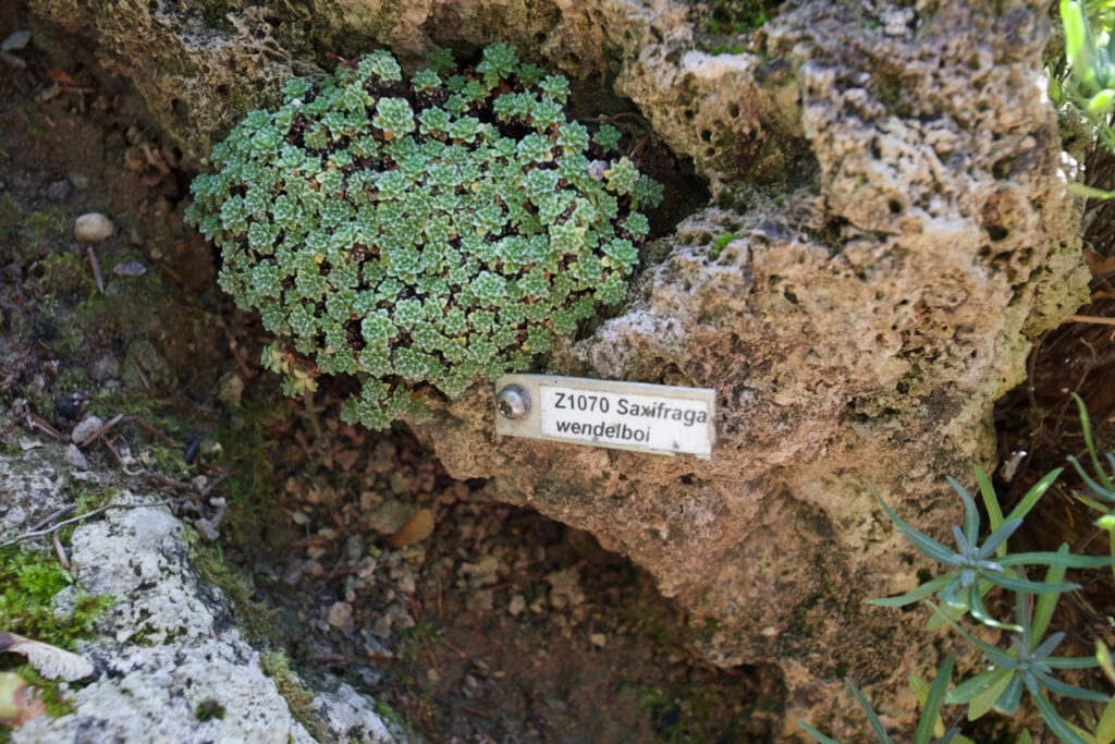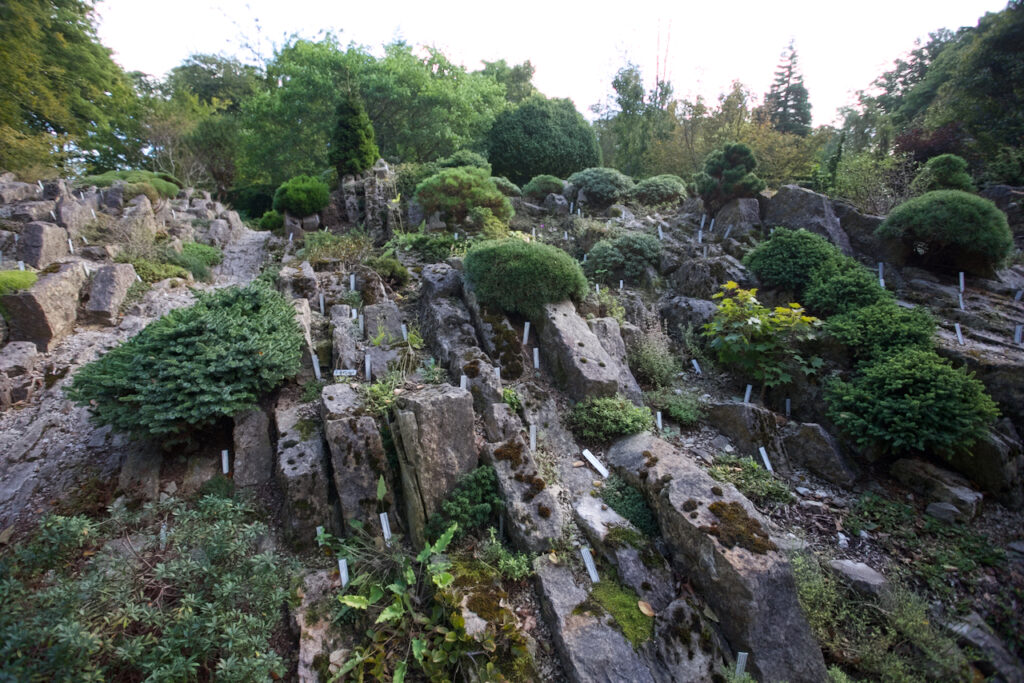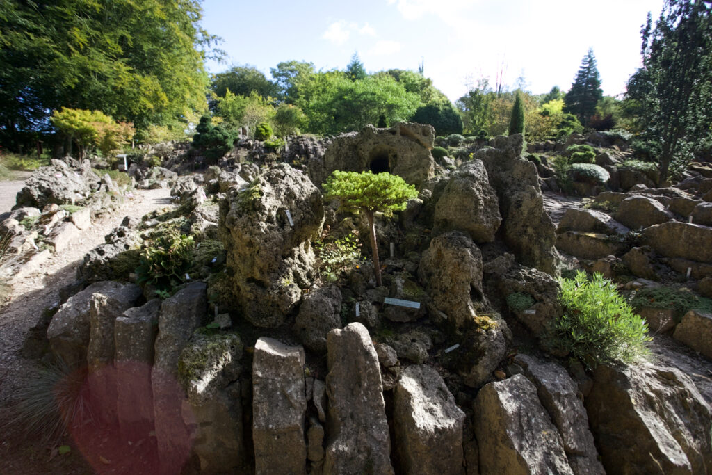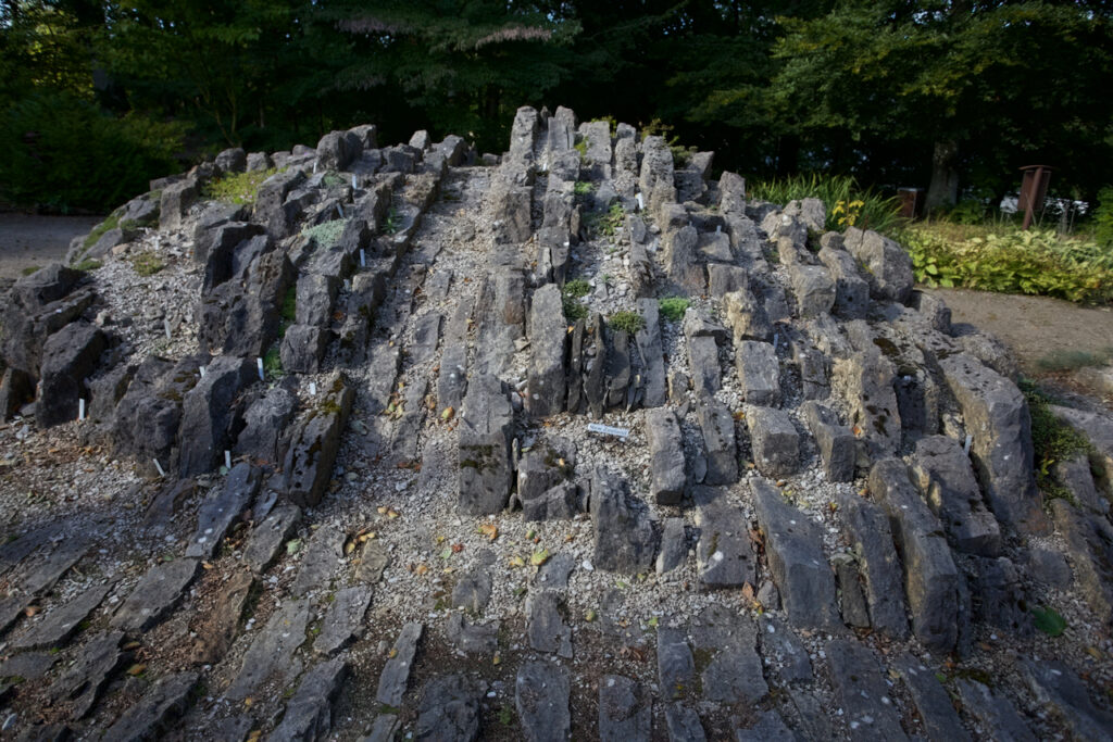 Gleich am Anfang befinden sich Spaltenbeete und Tuffbeete. Das Gestein für das Tuffbeet hierfür stammt aus einem Steinbruch in der Nähe von München, wie man auf einer Hinweistafel lesen kann.