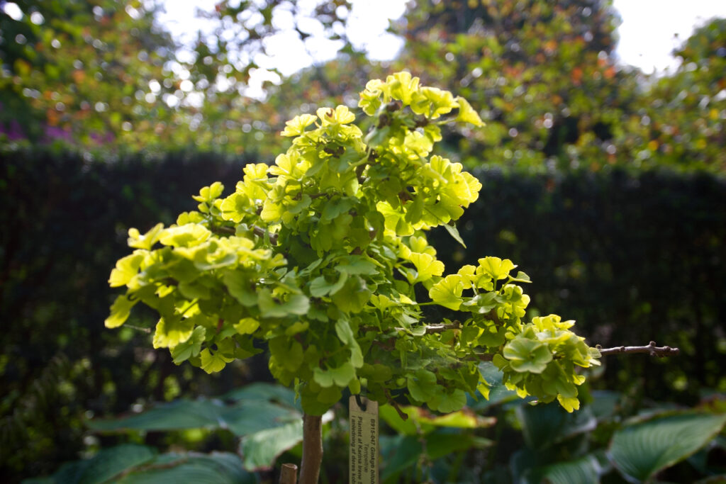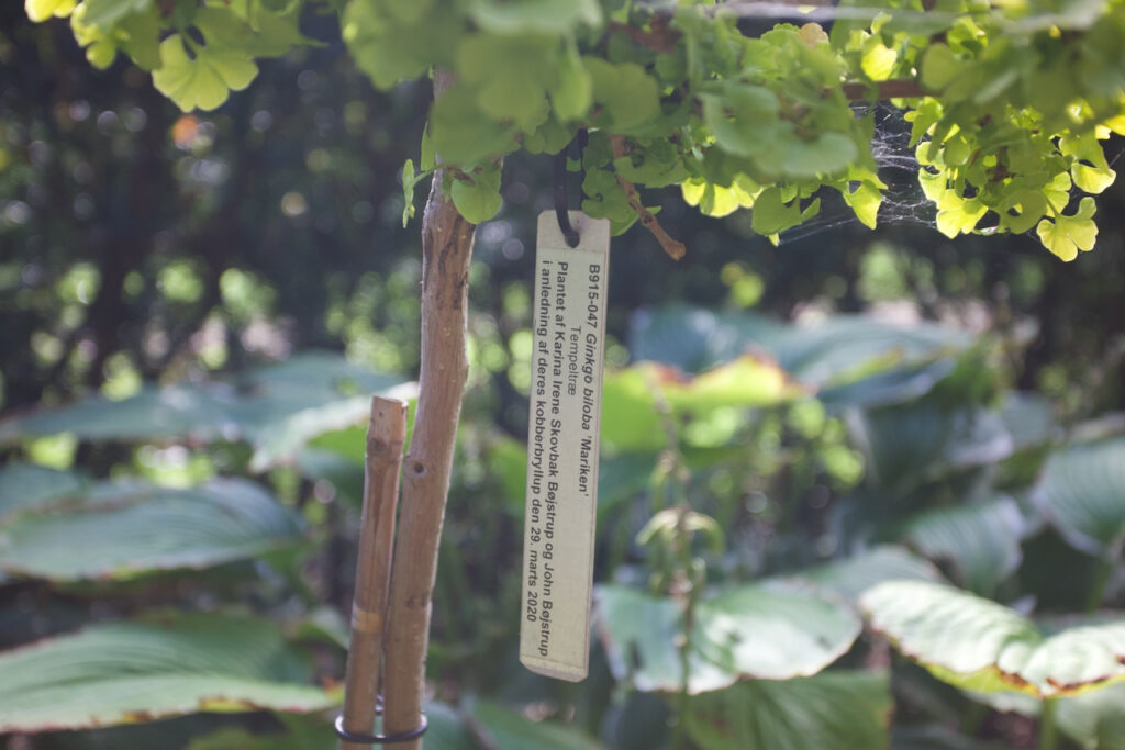 Sehr gut gefällt mir auch dieser Mini Ginkgobaum. Viele Gehölze in diesem Botanischen Garten werden von Familien gekauft und gespendet. Auf diesem Schild kann man sehen, dass er anlässlich ihrer Kupferhochzeit (kobberbryllup) gekauft wurde. Eine sehr schöne Idee.